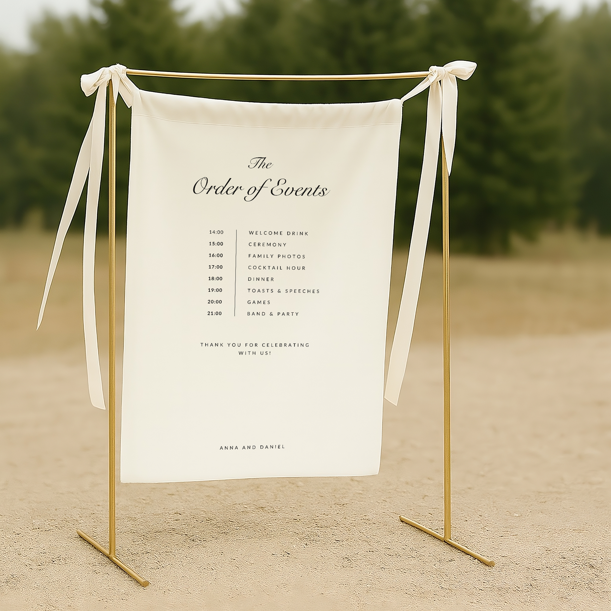 Create a stunning first impression with our elegant Order of Events Wedding Banner – a timeless detail for your ceremony or reception. Designed to guide your guests with style, this fabric banner adds a refined, personal touch to your wedding décor.