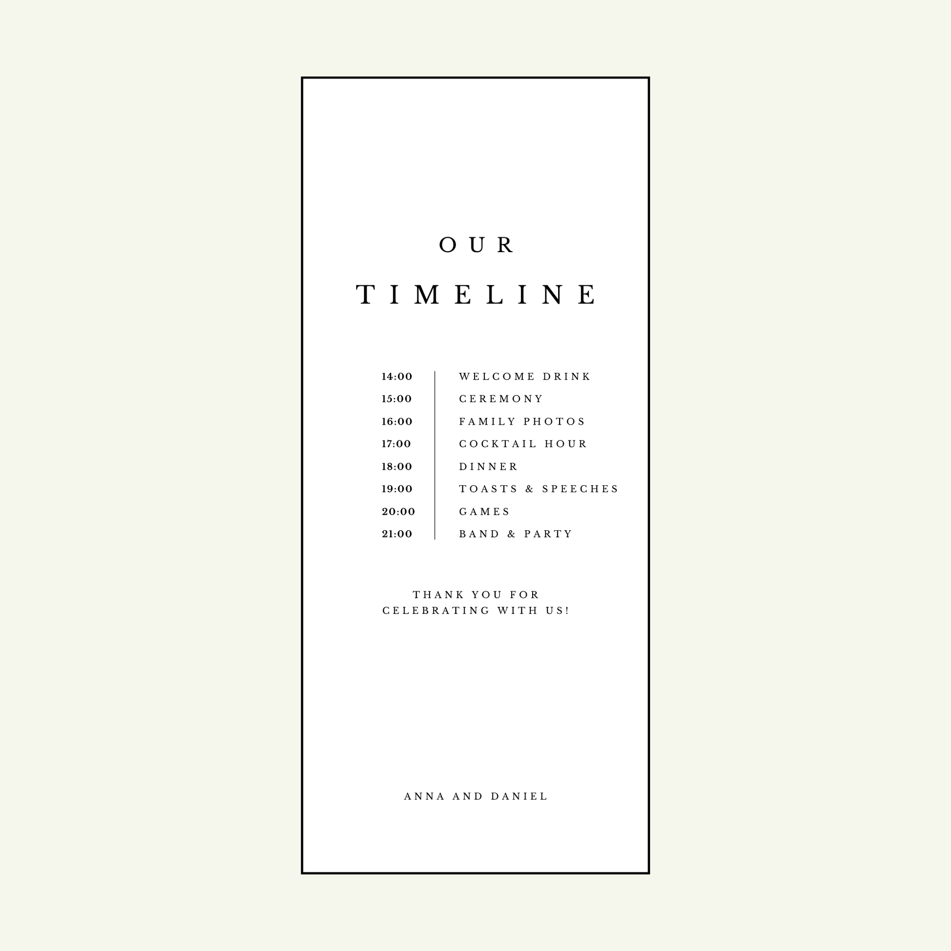 Turn your wedding timeline into more than just an itinerary — make it a beautiful keepsake that captures the spirit of your day. Perfect for weddings, elopements, and vow renewals alike.