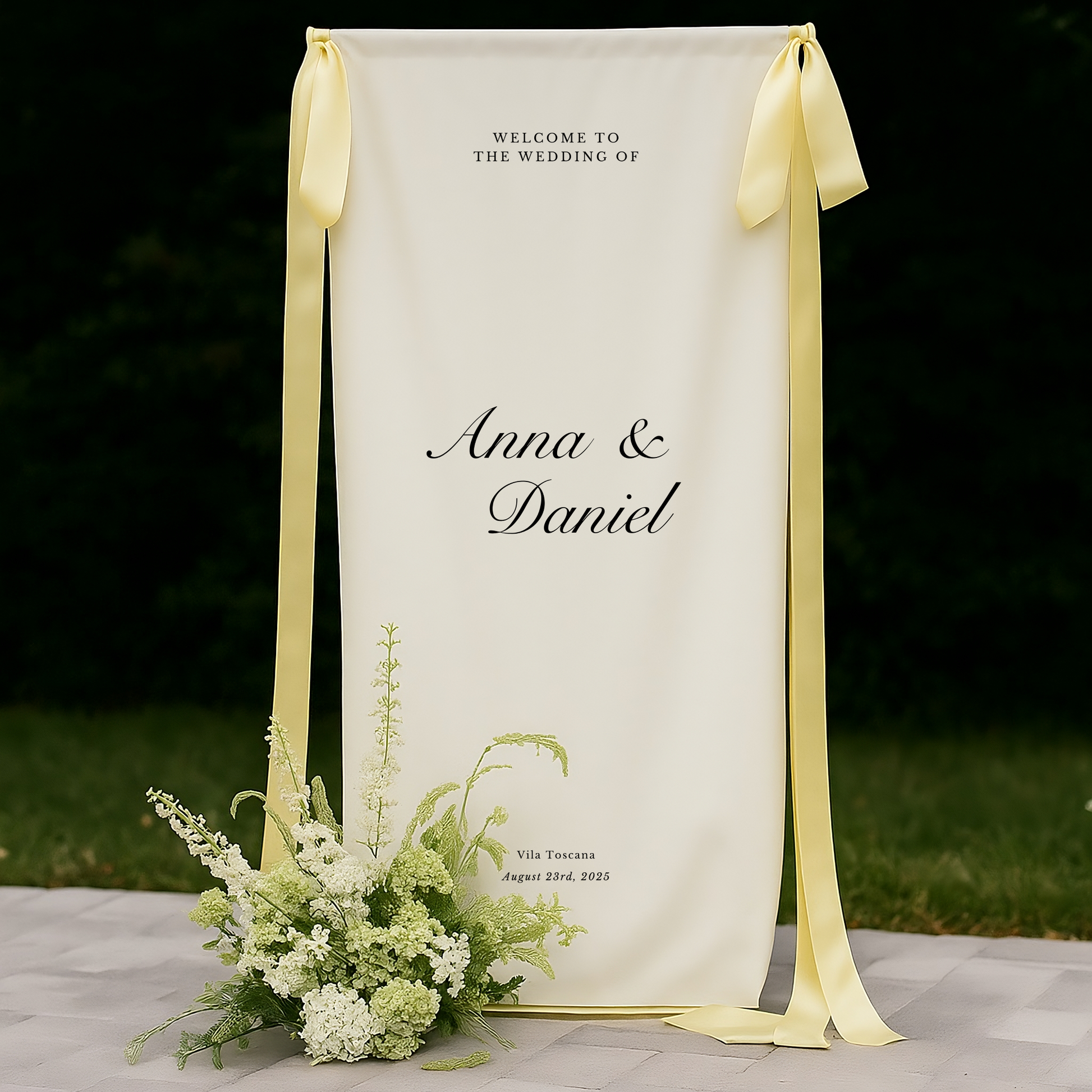 Create a warm, unforgettable welcome for your guests with our elegant Toscana Welcome Sign — the perfect first touch for your wedding or special event. Designed to set the tone with timeless charm, this fabric sign adds a sophisticated, personal accent to your ceremony or reception décor.